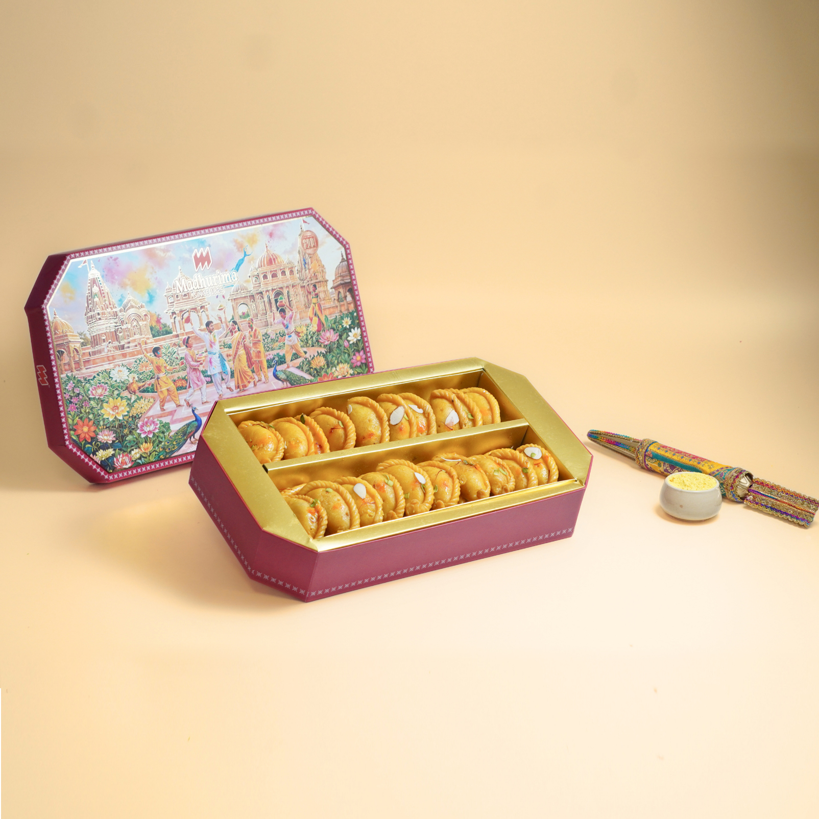 This Gujiya Majorly contains the rich flavour of Saffron and Stuffed with Dry Fruits Saffron, Coconut and Khoya. Free Gulaal with every Gujiya Box.
